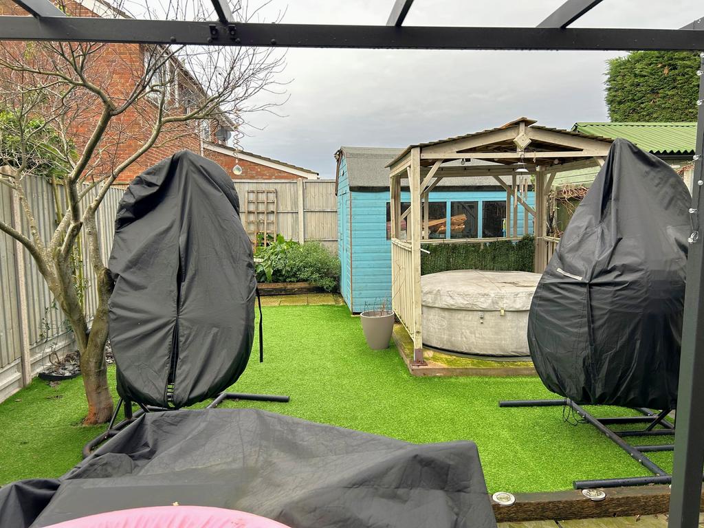 REAR GARDEN Full width paved patio leading to artificial lawned area, canopy over area suitable for hot tub, timber shed with power & light. Outside tap. The garden is fully fenced