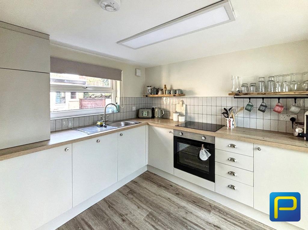 The kitchen has a clean, modern, and minimalist design with a light and airy feel. The cabinetry is sleek and handle-free in a soft matte white, paired with light wood-effect worktops. The kitchen includes a built-in electric oven, and a black ceramic hob. There are sliding doors leading to the conservatory.