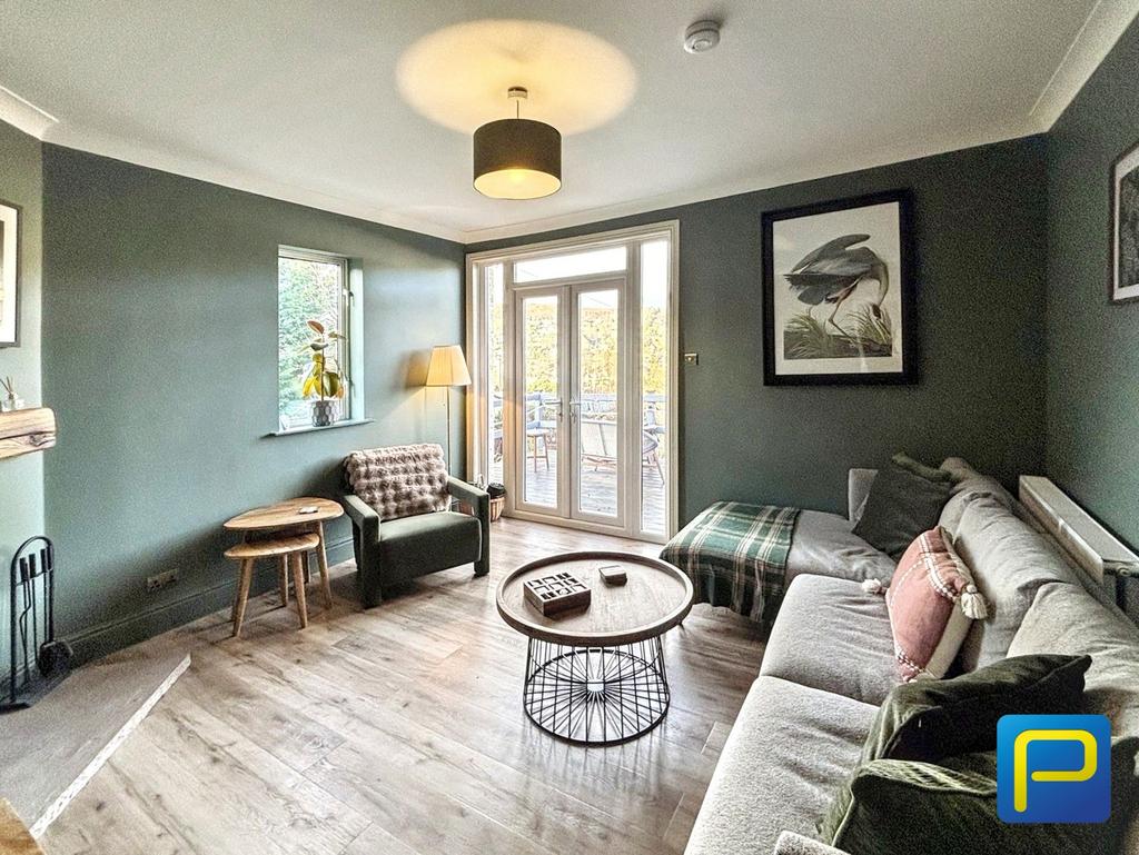 The living room has a modern, cosy feel. There is a wood-burning stove set into a recessed area, framed by a chunky rustic wooden mantel. There are patio doors leading to a decked seating area.