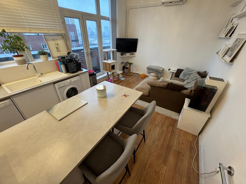 The open-plan living space benefits from air conditioning, ample natural light, and plenty of storage thanks to fitted shelving and floor to ceiling windows throughout. The kitchen is fully equipped with modern appliances, including a dishwasher, washing machine, and fridge freezer, making it ready to move in.