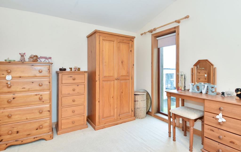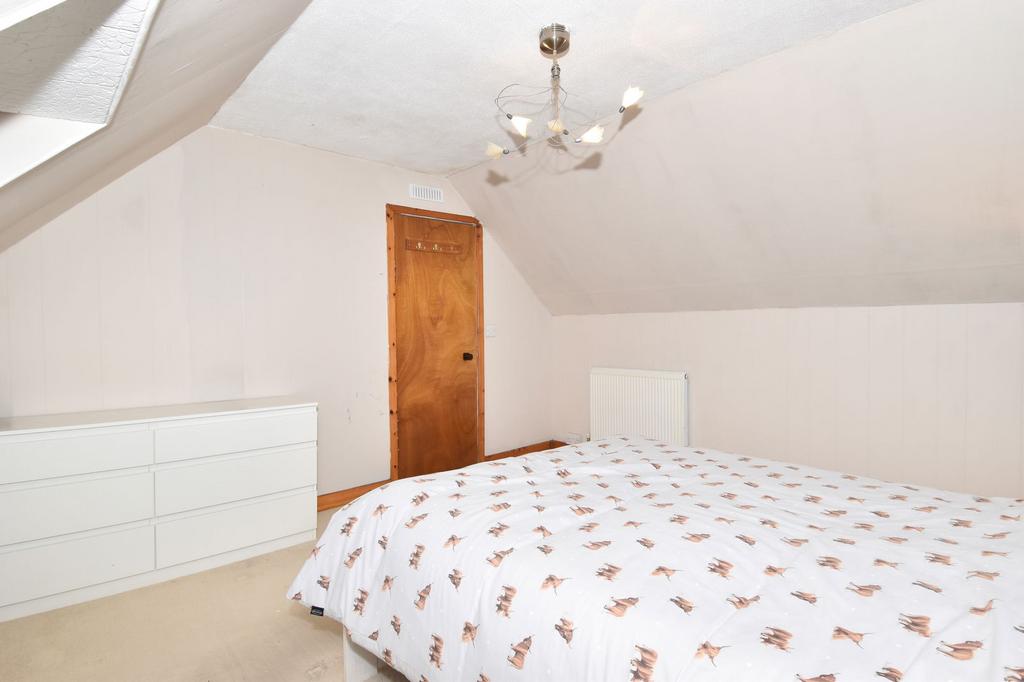 On reaching the first floor, the second bedroom is located to the right. This bedroom is well presented, with a dormer window and a feature wood-panelled wall. Two further bedrooms are located on this level, one of which includes built-in storage. The first floor is finished with a bathroom featuring a bath with overhead shower, W.C. and hand basin.