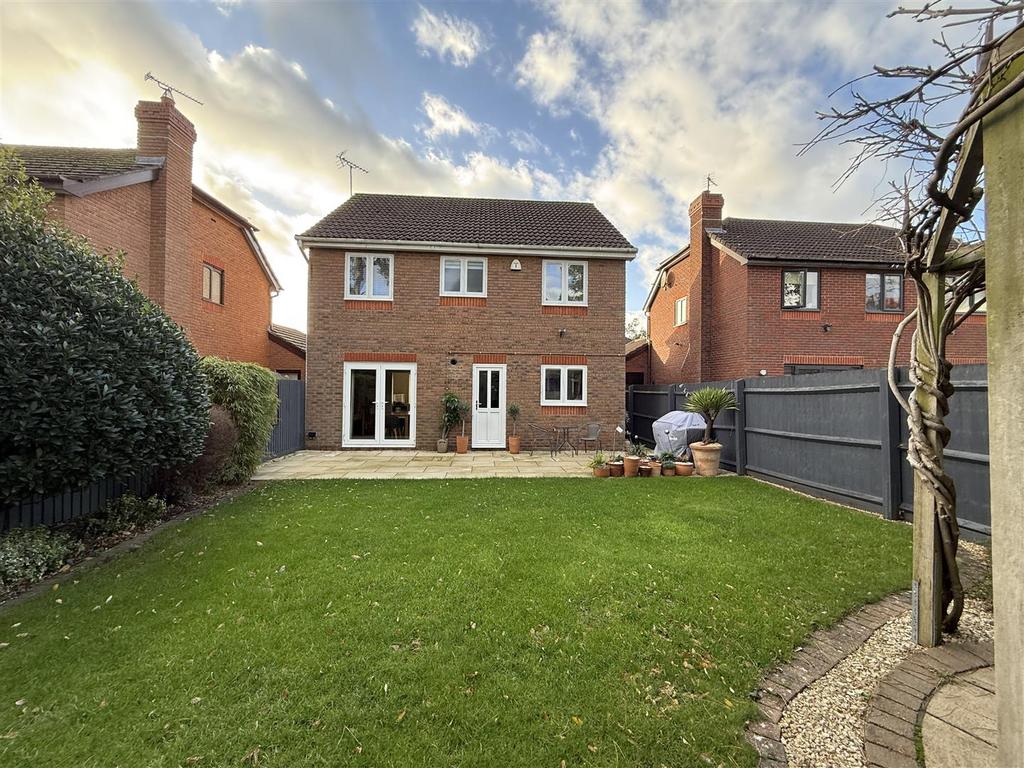 This stunning & spacious detached family home sits proudly in a peaceful cul de sac within a lovely village setting, offering beautiful interiors & thoughtful spaces throughout. From the moment you step into the welcoming entrance hall, the quality & care put into this home are immediately clear. The heart of the home is the fabulous dining kitchen, fitted with ample wall & base cabinetry, contrasting worktops, an inset sink, eye level double oven & a full range of integrated appliances including two fridges, freezer, dishwasher & washing machine. A stylish breakfast bar provides the perfect spot for informal dining, morning coffee or catching up with family. For more formal occasions, the separate dining room offers a wonderful space to entertain, with French doors opening directly into the garden & double doors flowing through into the lounge. The lounge itself is a beautifully bright room with a bay window & feature fireplace, creating a warm & inviting place to unwind at the end of the day. A dedicated home office provides an ideal work-from-home environment but could just as easily be used as a playroom or a generous fifth bedroom. A downstairs cloakroom adds further convenience. Upstairs, the landing leads to four generous double bedrooms. Bedrooms one & three benefit from fitted wardrobes, while the impressive primary suite features its own seating area—perfect for a quiet reading nook or dressing space & a private en suite shower room. The family bathroom serves the remaining bedrooms & offers a relaxing place to soak & unwind. Outside, the home continues to impress with a driveway, garage ideal for storage & a beautifully landscaped rear garden that enjoys a non-overlooked position. With a well-kept lawn, several patio areas for outdoor dining & entertaining & a stunning pergola draped in wisteria, the garden offers a truly magical setting to enjoy throughout the seasons.