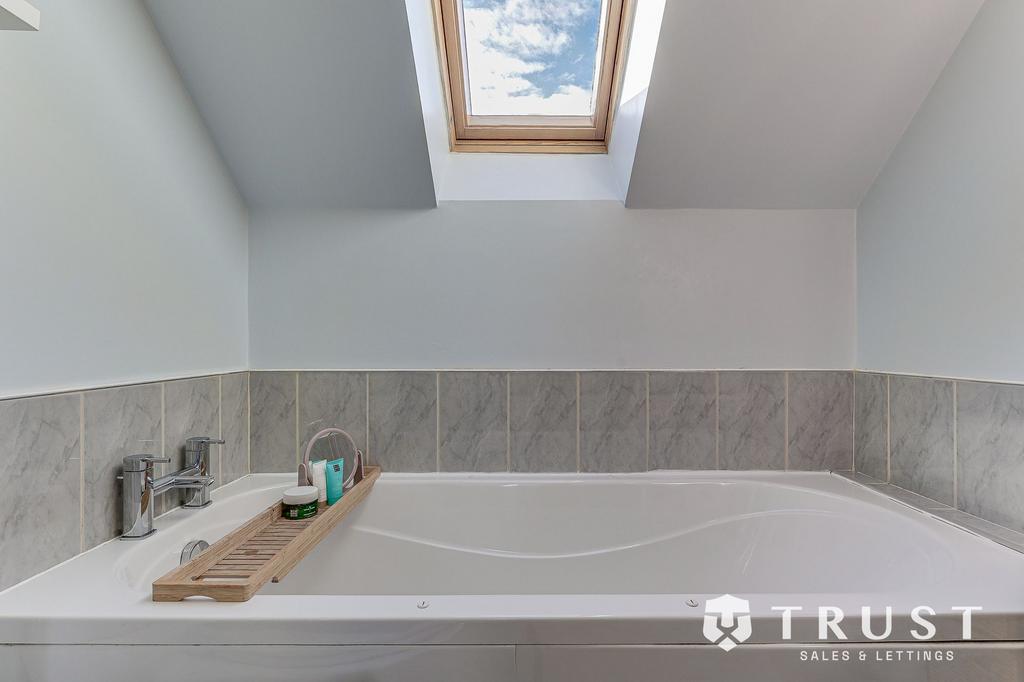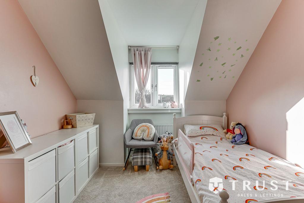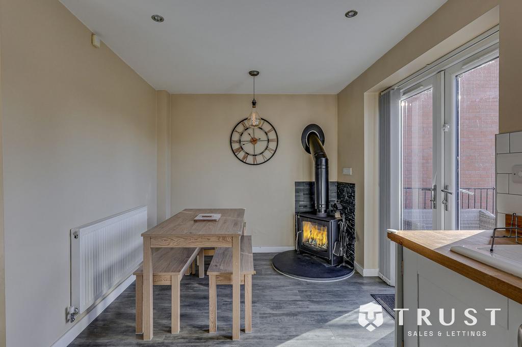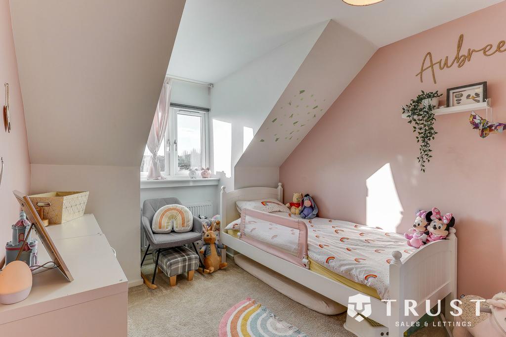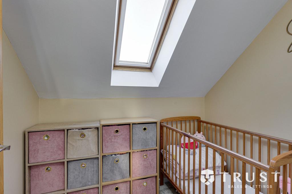 Upstairs, you will find a selection of well-proportioned bedrooms, each thoughtfully decorated with neutral tones, ample natural light, and practical built-in storage solutions. The charming children’s rooms feature sloped ceilings, dormer or Velux windows, and soft pastel colours, providing delightful spaces for play and rest. The main bedrooms benefit from modern decor, feature walls, and large windows, ensuring a serene and restful environment. The property’s three contemporary bathrooms are fitted with luxurious features such as sleek walk-in showers, modern bath-tubs beneath skylights for a spa-like experience, heated towel rails, and stylish tiling. Additional highlights include a cosy dining area with a wood burning stove and French doors opening to the garden, a modern staircase with decorative wall elements, and secure off-road parking. The attractive modern brick exterior, accentuated by dormer windows, completes the property’s impressive kerb appeal. With its seamless blend of style, functionality, and generous outdoor space, this home is perfectly suited for modern family living and entertaining.