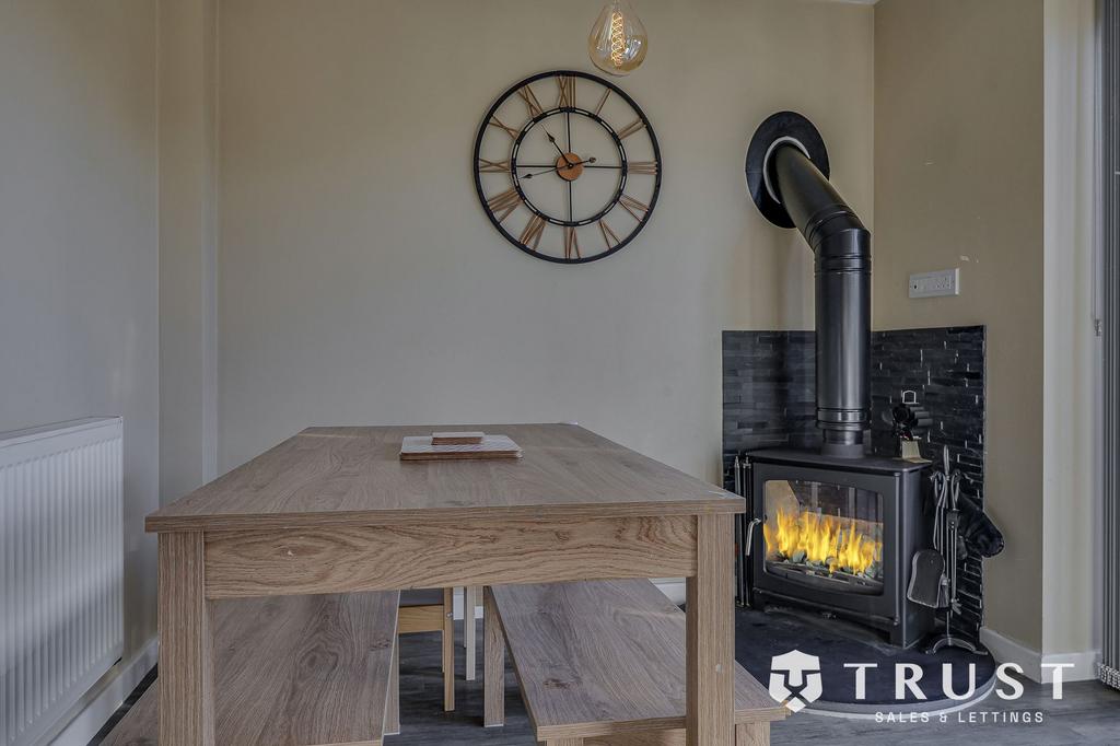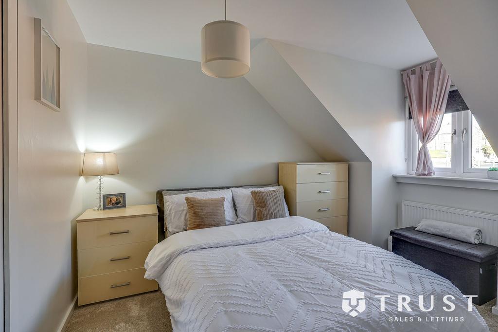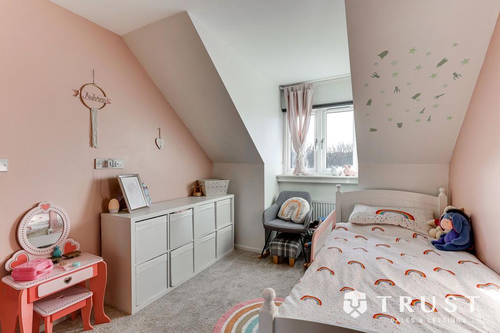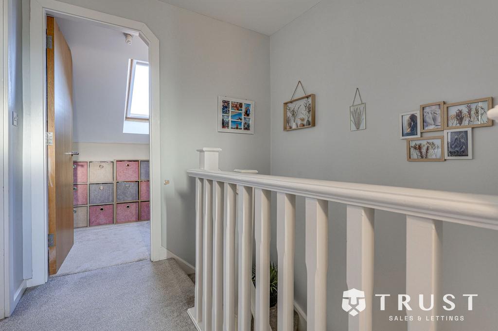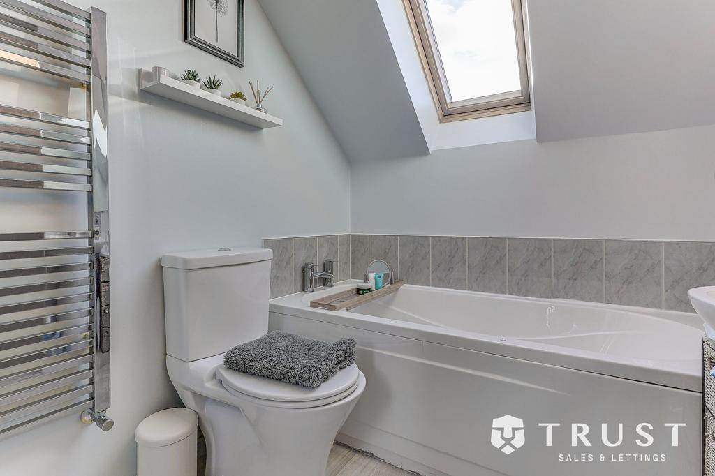 Upstairs, you will find a selection of well-proportioned bedrooms, each thoughtfully decorated with neutral tones, ample natural light, and practical built-in storage solutions. The charming children’s rooms feature sloped ceilings, dormer or Velux windows, and soft pastel colours, providing delightful spaces for play and rest. The main bedrooms benefit from modern decor, feature walls, and large windows, ensuring a serene and restful environment. The property’s three contemporary bathrooms are fitted with luxurious features such as sleek walk-in showers, modern bath-tubs beneath skylights for a spa-like experience, heated towel rails, and stylish tiling. Additional highlights include a cosy dining area with a wood burning stove and French doors opening to the garden, a modern staircase with decorative wall elements, and secure off-road parking. The attractive modern brick exterior, accentuated by dormer windows, completes the property’s impressive kerb appeal. With its seamless blend of style, functionality, and generous outdoor space, this home is perfectly suited for modern family living and entertaining.