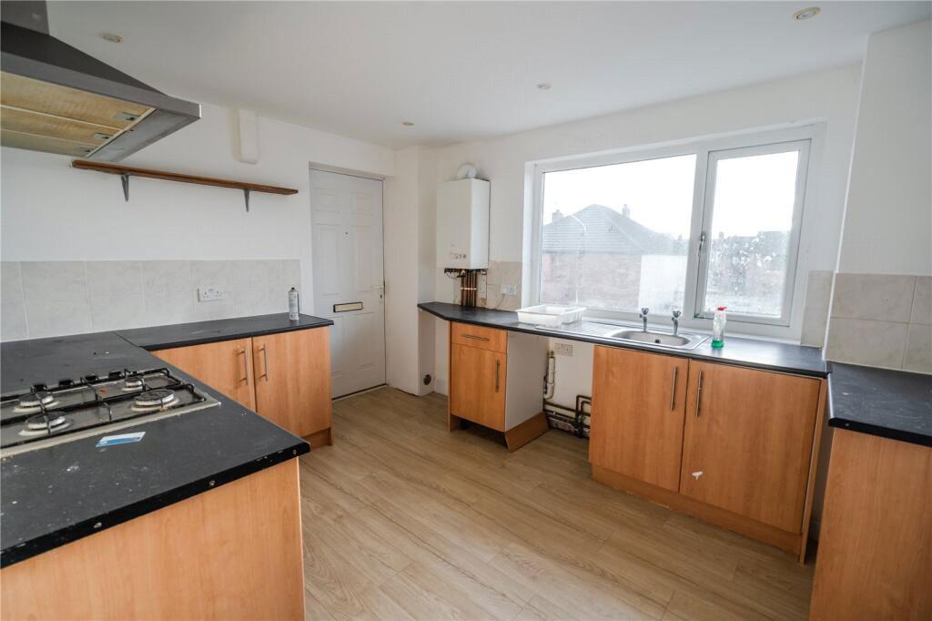 With door to rear staircase. Partially tiled walls and fitted with a selection of wall and base units incorporating a sink unit with drainer and having integrated electric oven, gas hob and extractor canopy. Radiator and uPVC double glazed window unit.