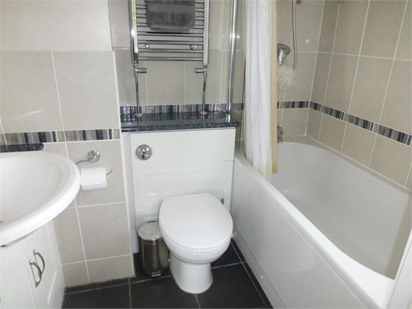 UPVC opaque window with side aspect, low flush WC, contemporary basin with mixer tap, cupboard under and mirror over, chrome heated towel rail, wood laminate flooring.