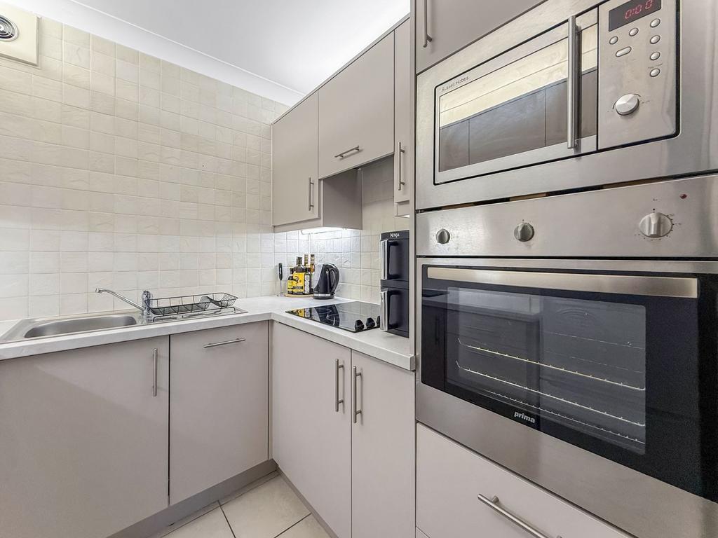 The lounge is a particularly impressive space, generous in size and enhanced by double-aspect windows which flood the room with natural light. The upgraded kitchen is finished in stylish cashmere toned cabinetry with chrome finishes and a tiled splashback above the worktops. Integrated appliances include an electric oven and microwave, induction hob with extractor hood, and an integrated dishwasher, with space for a freestanding fridge freezer.