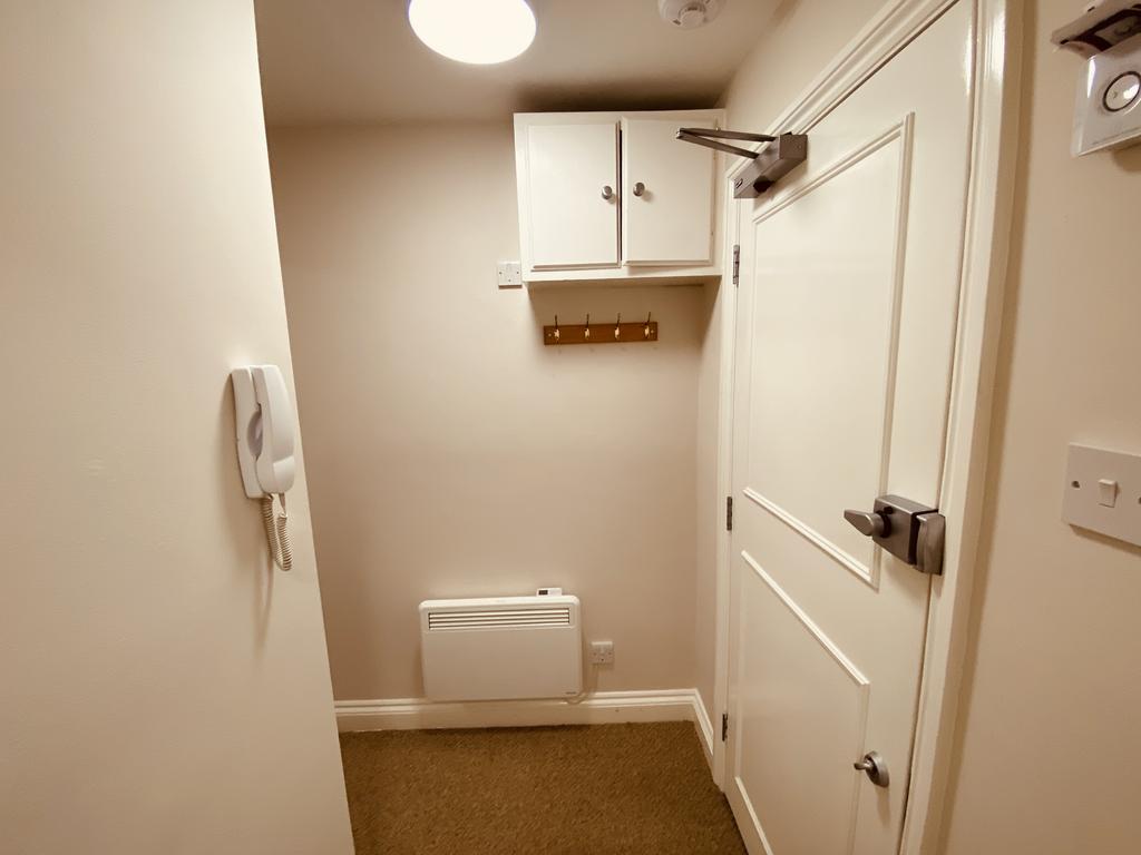The studio room is generously sized, featuring fresh neutral décor and fitted carpets, with multiple pieces of quality furniture including ample wardrobes, chests of drawers, and a convenient desk and chair, ideal for working or studying from home. Three windows bath the living space in sunshine, while heavy curtains ensure privacy and comfort.