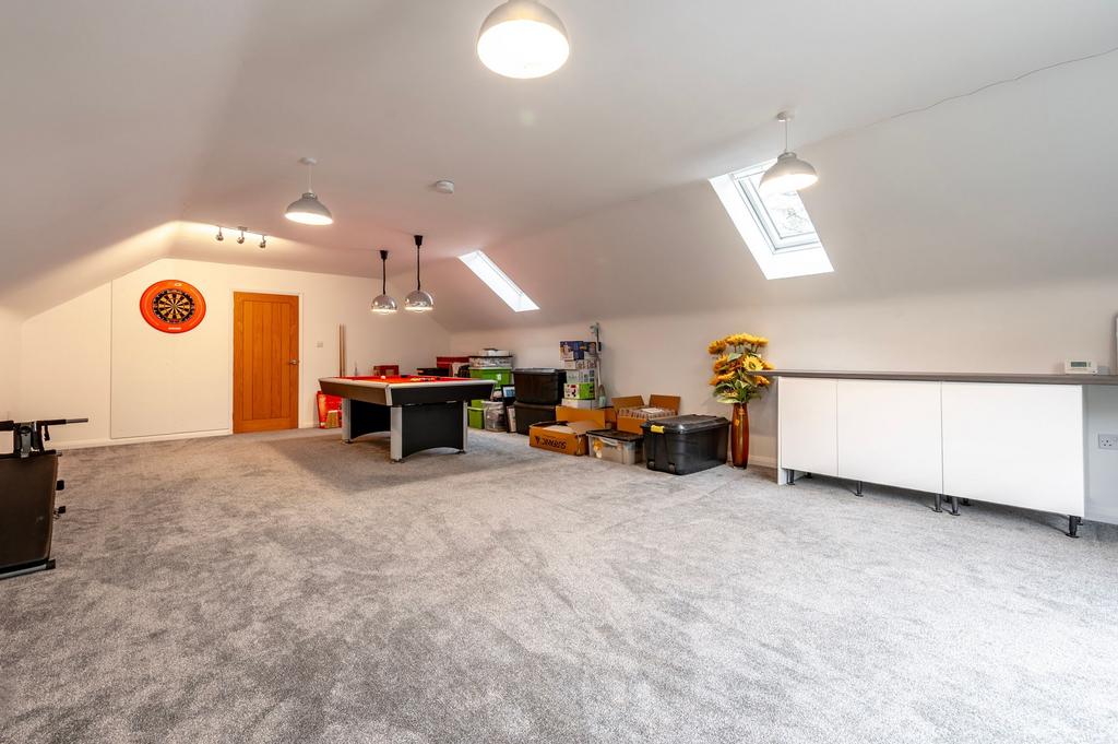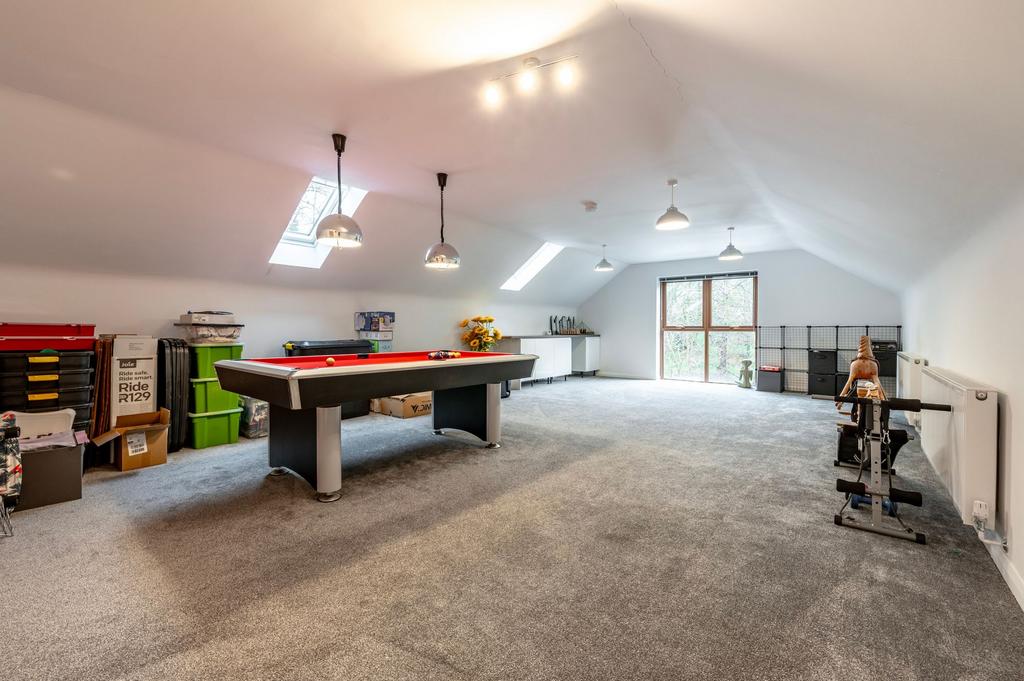 The first-floor living room is a standout feature of the home, currently arranged as an entertainment space complete with a pool table and stylish pendant lighting. Its generous proportions and abundance of natural light make it an incredibly versatile area, easily adaptable to suit a variety of needs, whether as a spacious bedroom, a large home office, or a dedicated studio for hobbies and creative pursuits. Large windows frame views over the garden and the woodland beyond, bringing a sense of calm and openness to the space. The room’s scale and flexibility ensure it can evolve alongside the family’s lifestyle.