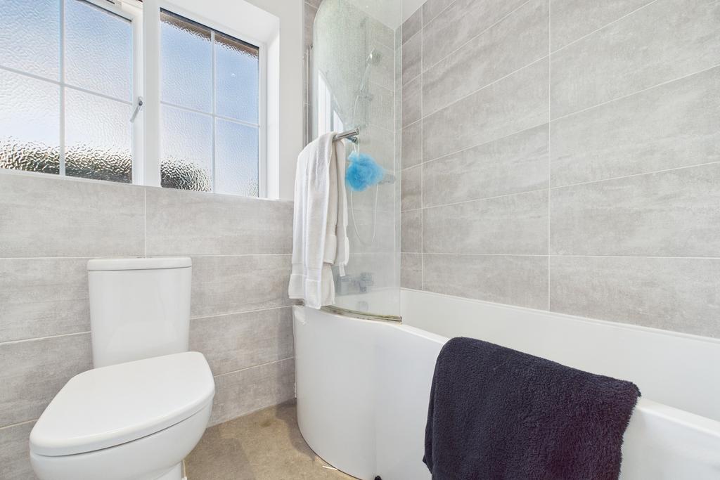 Three piece bathroom suite incorporating a bathtub with a mixer tap and a shower over, pedestal wash hand basin with a mixer tap and a push button WC. Decorative tiles to the wet areas and a window to the rear elevation.