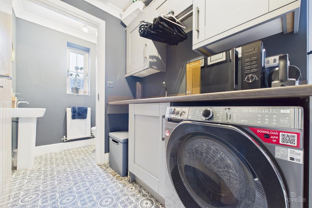 Range of wall and base units with a contrasting work surface and upstand. Plumbing for a washing machine and space for a tumble dryer. Stainless steel sink and drainer with a swan neck mixer tap. Half glazed UPVC door to the side elevation.