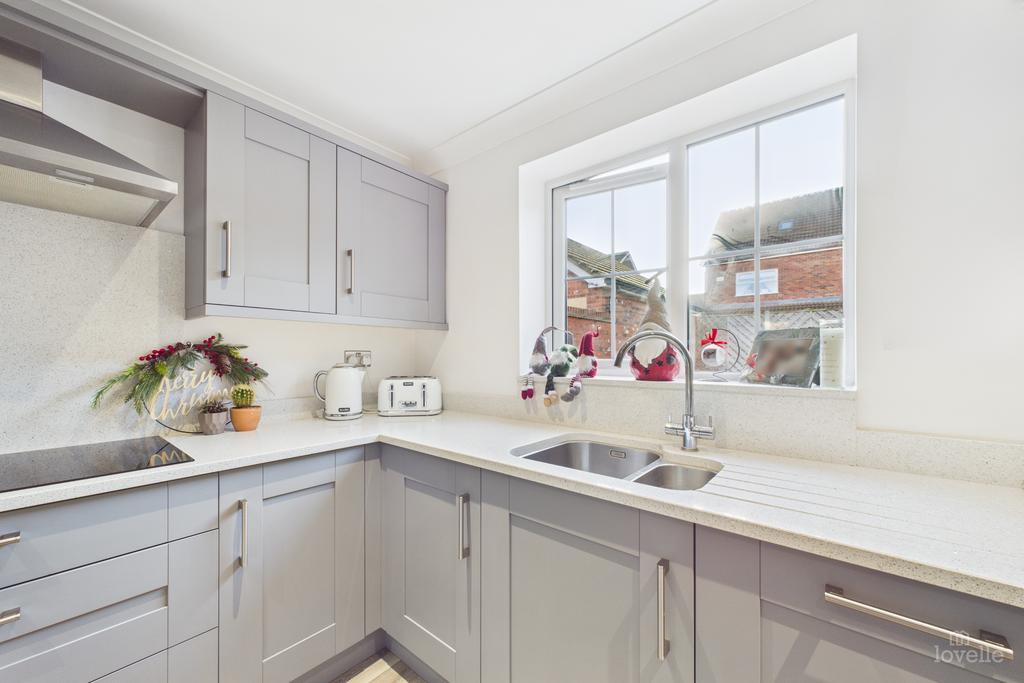 Range of wall and base units in a dove grey finish with contrasting quartz work surfaces and upstands. Inset stainless steel sink and drainer with a swan neck mixer tap. Inset double electric oven and a five ring hob with an extraction canopy over. Integral dishwasher and a tall fridge freezer.