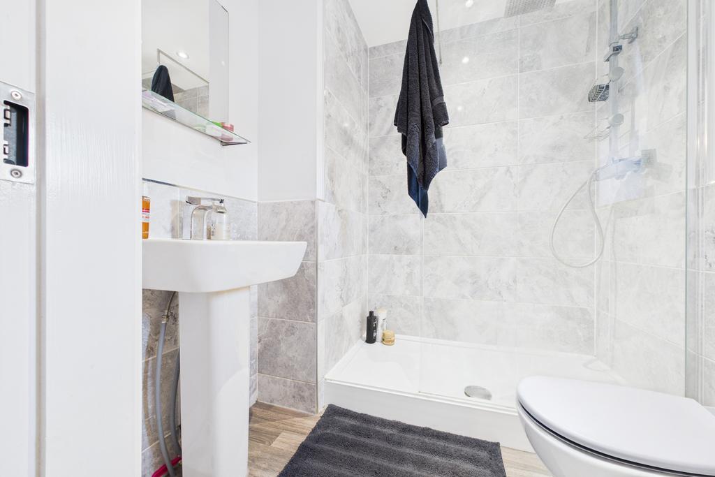 Three piece suite incorporating a shower cubicle with a rain shower over, push button WC and a pedestal wash hand basin with a mixer tap. Decorative tiles to the wet areas.