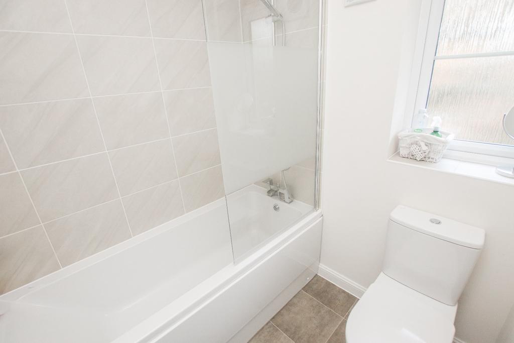 Climbing the carpeted staircase with balustrade, the landing provides access to all bedrooms, the family bathroom, the airing cupboard, and a central radiator. Bedroom two is positioned at the rear and features fitted carpet, a radiator, and a rear aspect window overlooking the garden. Bedroom one, located at the front, is a generous double room with fitted carpet, a radiator, ample sockets, and a front-facing window. This bedroom also benefits from a private ensuite shower room, fitted with tiled flooring, a walk-in shower, wash basin, WC, and a shaver point. Bedroom three is also found at the front and offers fitted carpet, a radiator, and a front aspect window — ideal as a child’s bedroom, nursery, dressing room, or home office. The family bathroom features tiled flooring, a panelled bath with shower attachment over, fully tiled shower area, wash basin, WC, a frosted uPVC window to the rear, radiator, and mirrored bathroom light.