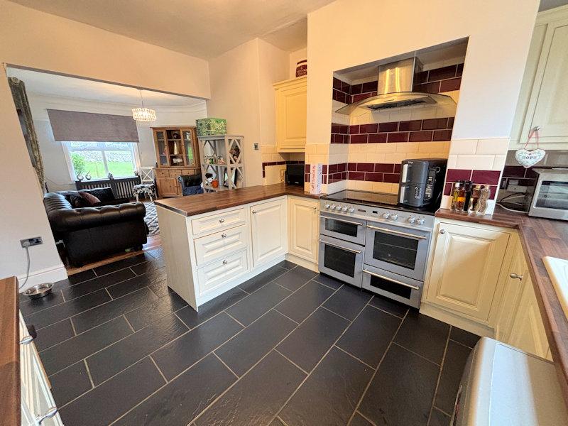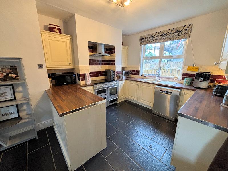 Window to side, cream units, laminate work top, plumbed for dishwasher, composite sink and drainer, range style cooker with extractor over, part tiled walls, tiled floor, open to former pantry with window to side and space for American style fridge freezer, half glazed door to: