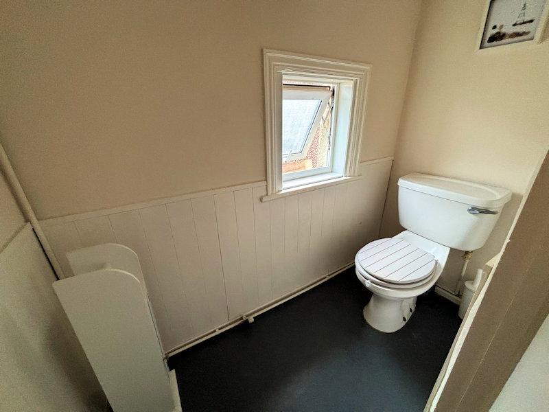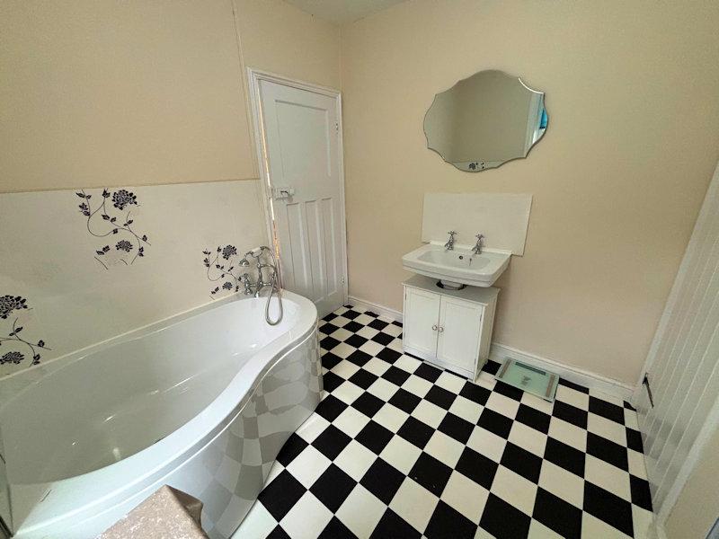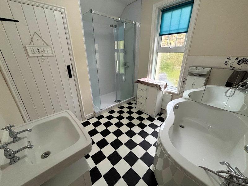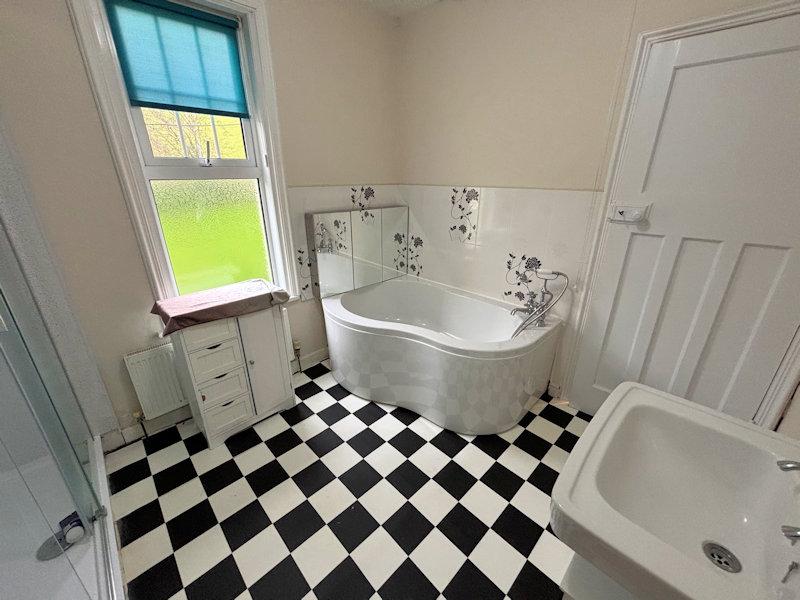 Window to rear, corner bath with shower head handset, wash basin, panelled walk in shower, built in airing cupboard with hot water cylinder and slatted shelving, vinyl floor.