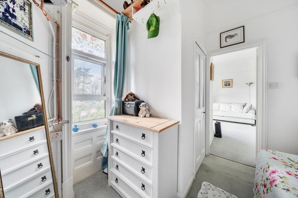 One of the flat’s standout features is its stunning period detailing, including elegant stained glass windows in the communal landing. The impressive communal entrance hall is finished with beautiful wooden flooring, a decorative fireplace, and a chandelier, setting a sophisticated tone from the moment you arrive at Brambledown. Thoughtfully placed decorative elements ensure the space remains both functional and stylish.