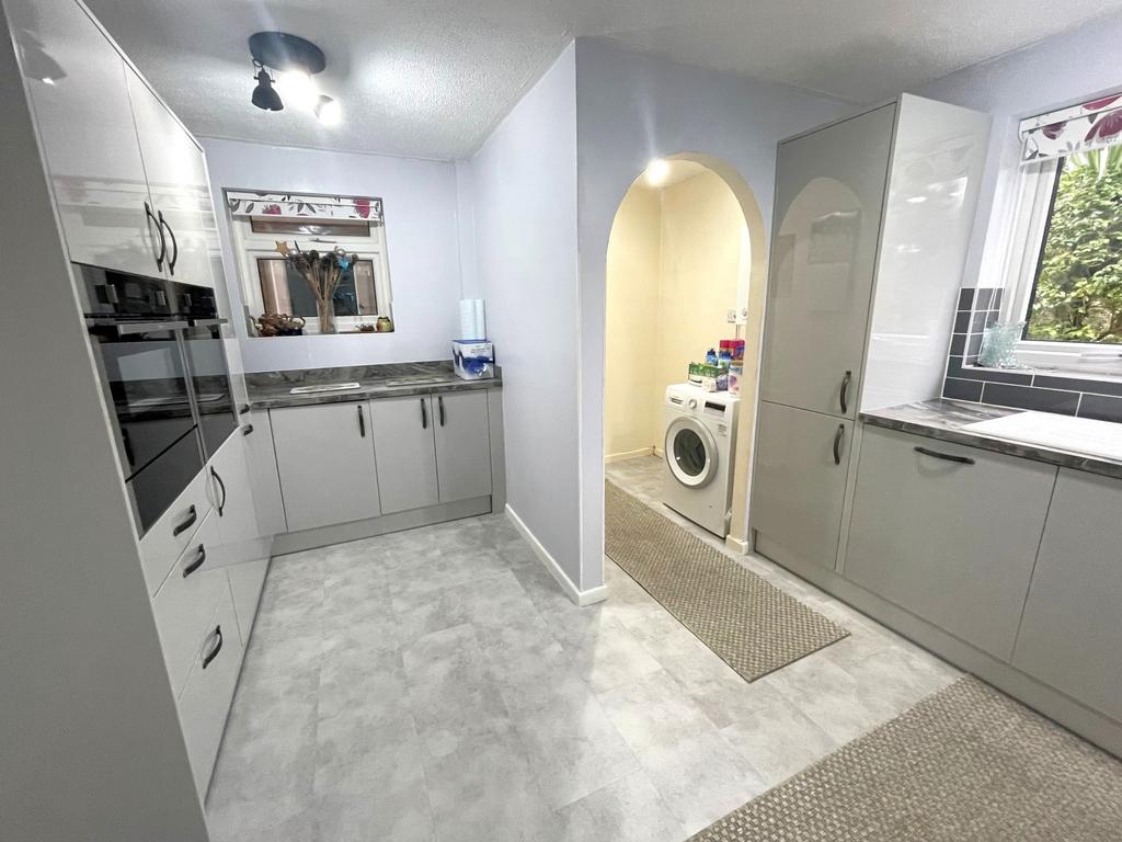 Space and plumbing for washing machine. Space for fridge freezer. Door to side.