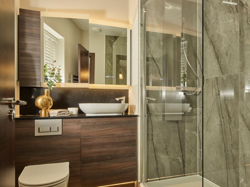 On the first floor, discover luxury in the three spacious bedrooms with flooring throughout and a modern high tech bathroom. Explore the spacious principal bedroom occupying the entire second floor, featuring a mirrored fitted wardrobe and modern en suite bathroom, as well as an area ideal for working from home.