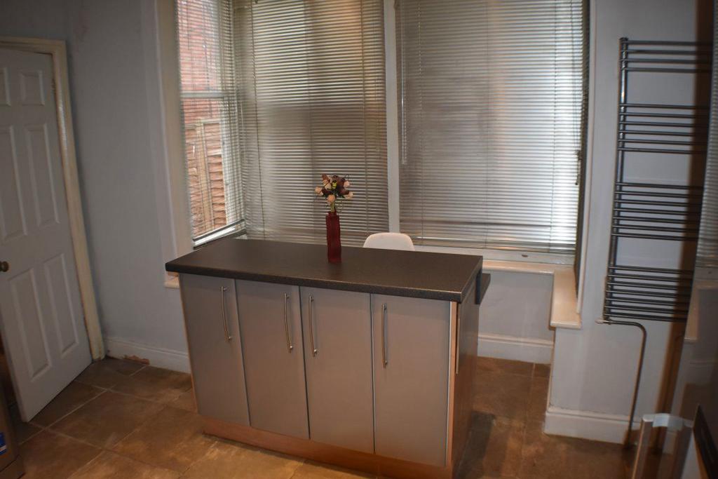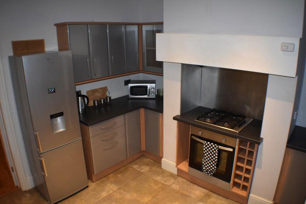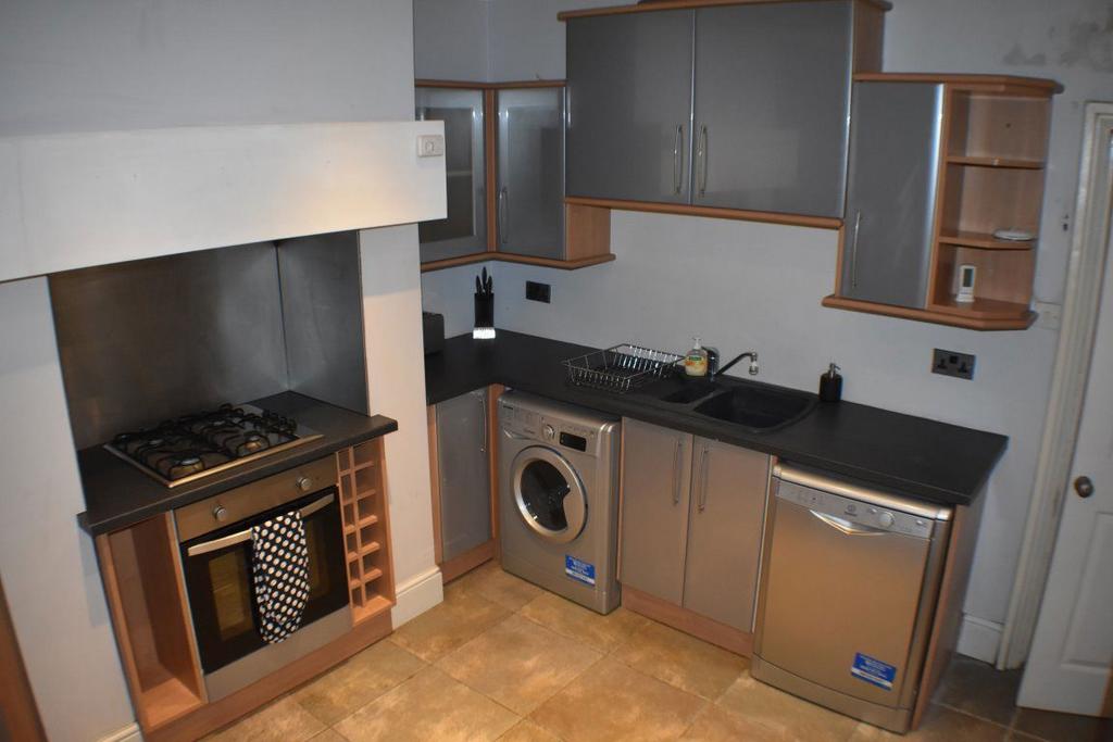 The kitchen sits to the rear and offers a good range of eye and base level units, a built-in oven and hob, and ceramic tiled flooring. A walk-in bay window overlooks the rear garden and brings in additional light.