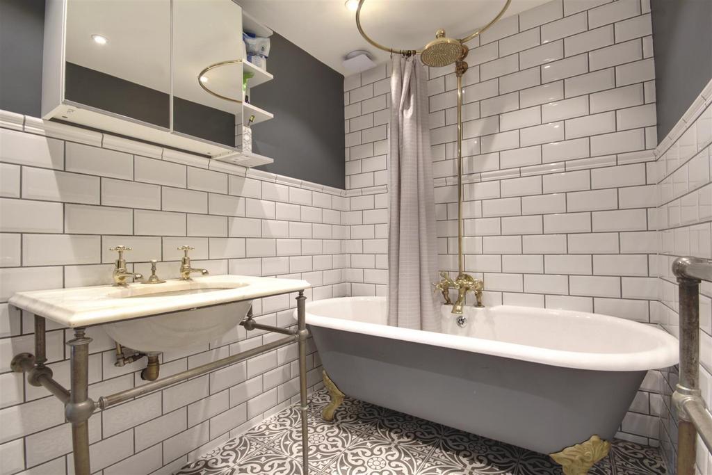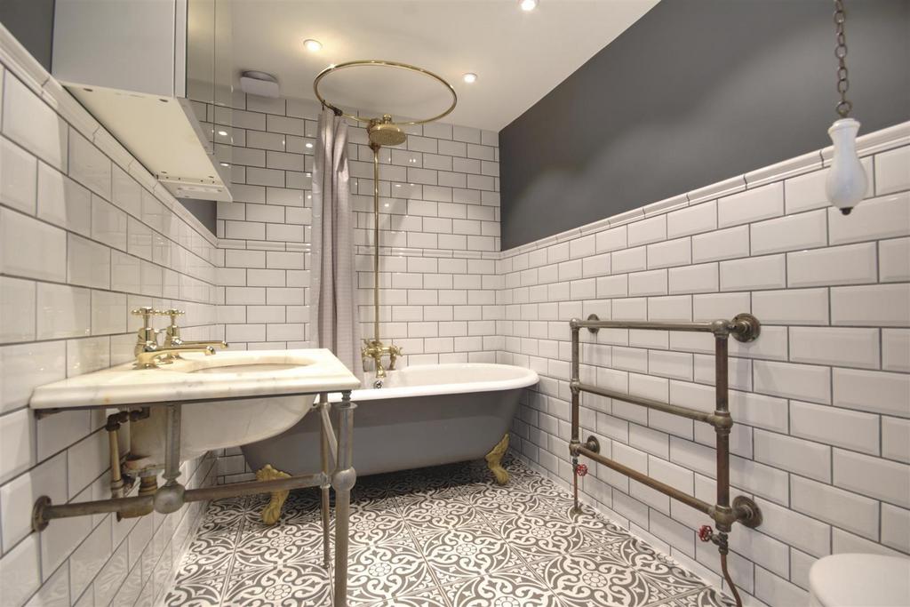 To the first-floor, bedroom one benefits from a modern en-suite shower area, with a bespoke copper pipe heated towel rail, and beautiful copper dual showers. There are two further bedrooms on this floor, one of which is currently used as a dressing room. The stunning bathroom, is based around the French Victorian era, with a beautiful roll top bath with vintage brass fittings and shower over, and the sink is believed to date back to the late 19th century, and was made by Shanks & Co of Barrhead, Scotland.