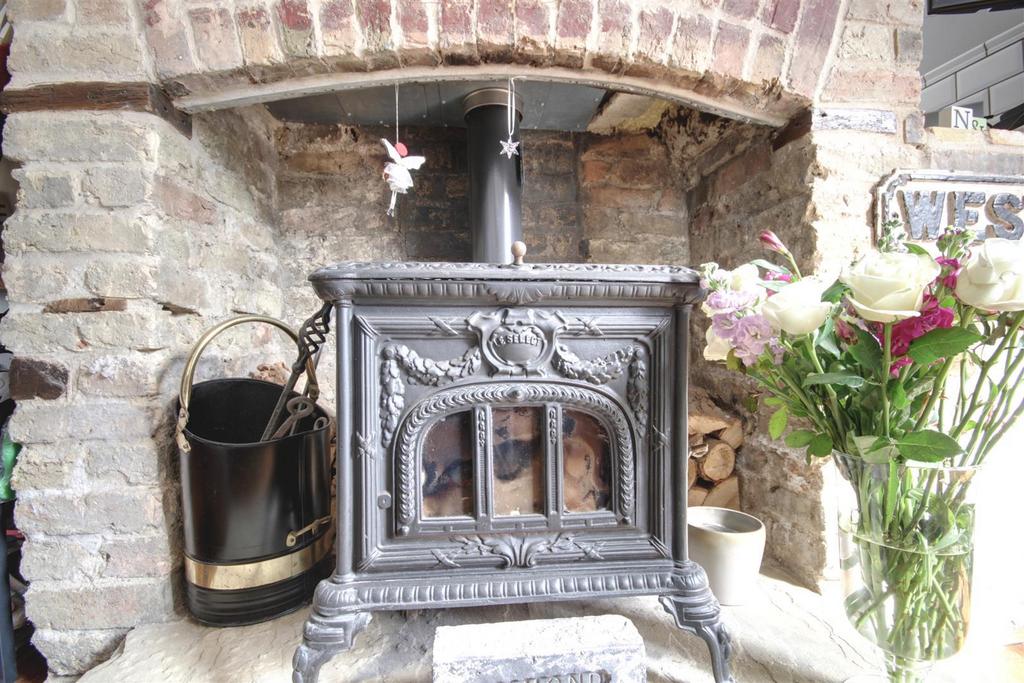 On the ground-floor there is a lounge/dining room, with dual aspect views, with an exposed brick fire-place and fitted with a 19th century French Victorian era, cast iron wood burning stove, accompanied by a cast iron radiator. An opening leads through to the modern kitchen, which has some integrated appliances including a washing machine, fridge, and slim-line dishwasher, and a butler style sink. There is a original beam within this area which came from the original roof structure and it is believed to date back to around 1807. A second cast iron radiator is featured and there is a small cupboard under the stairs, where a freezer can be place or used for storage.