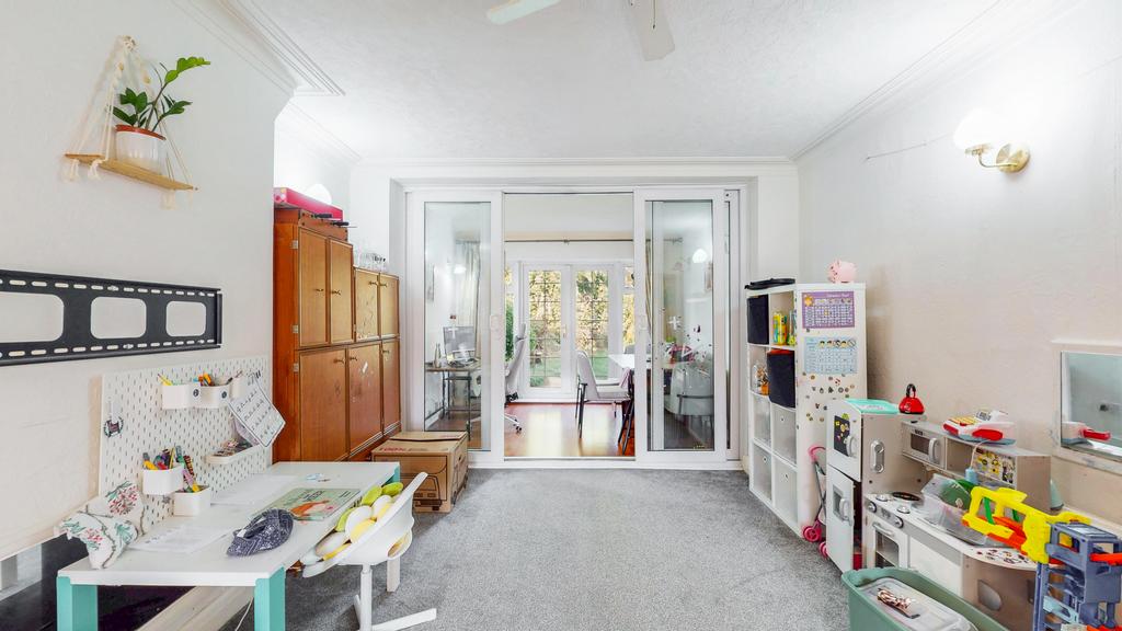 The living room benefits from a dining area and a study overlooking the garden.