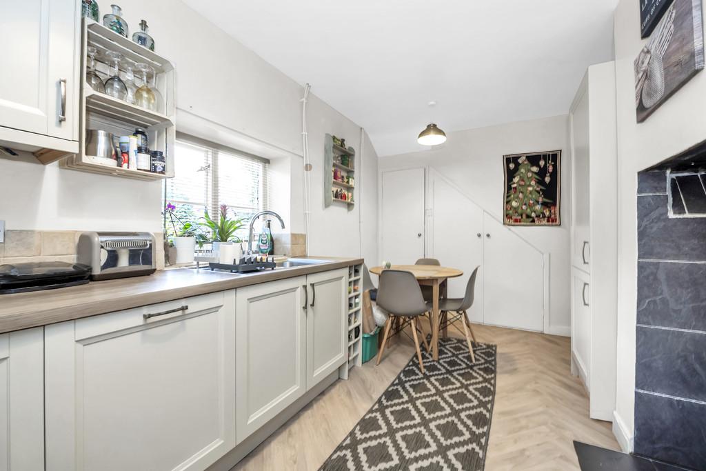 From the parking spaces at the rear of the property there is an entrance door into the rear hallway with door to the cloakroom / wc with window to rear. Bedroom three is on the ground floor with window to the front aspect. The kitchen is fitted with a range of wall and base units with integrated dishwasher, range cooker with extractor over and fridge freezer, log burner and window to rear. Door to utility room with gas boiler in situ and space for washing machine and tumble dryer. Handy storage cupboard. Through to the sitting room with feature fireplace and two arched windows to the front aspect. Entrance door leading to the side cottage garden.