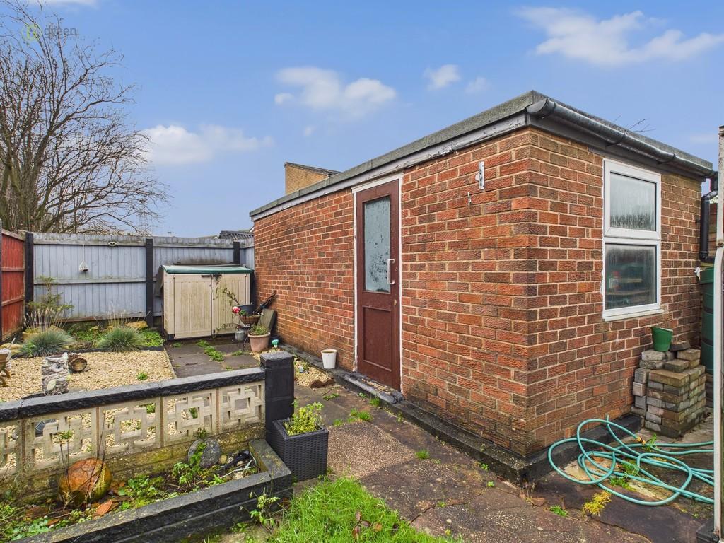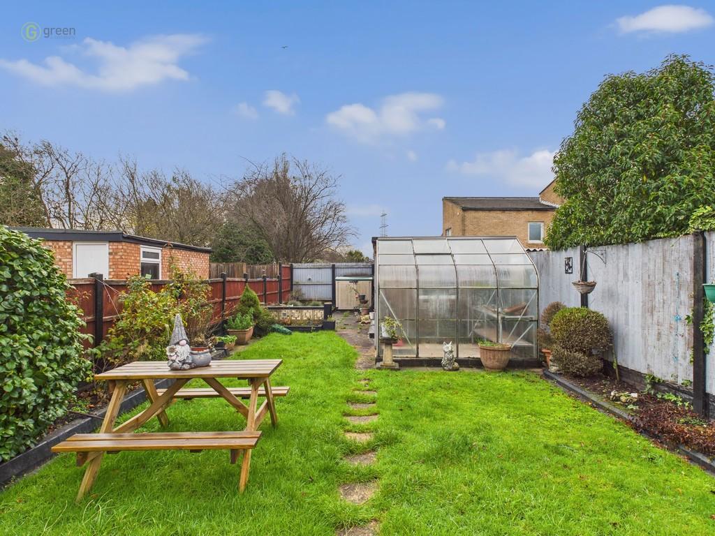 REAR GARDEN Bricked area, shrubs and plant either side of the lawn, separate area at the rear homing the garage which is accessed by a private road at the rear, greenhouse to the side.