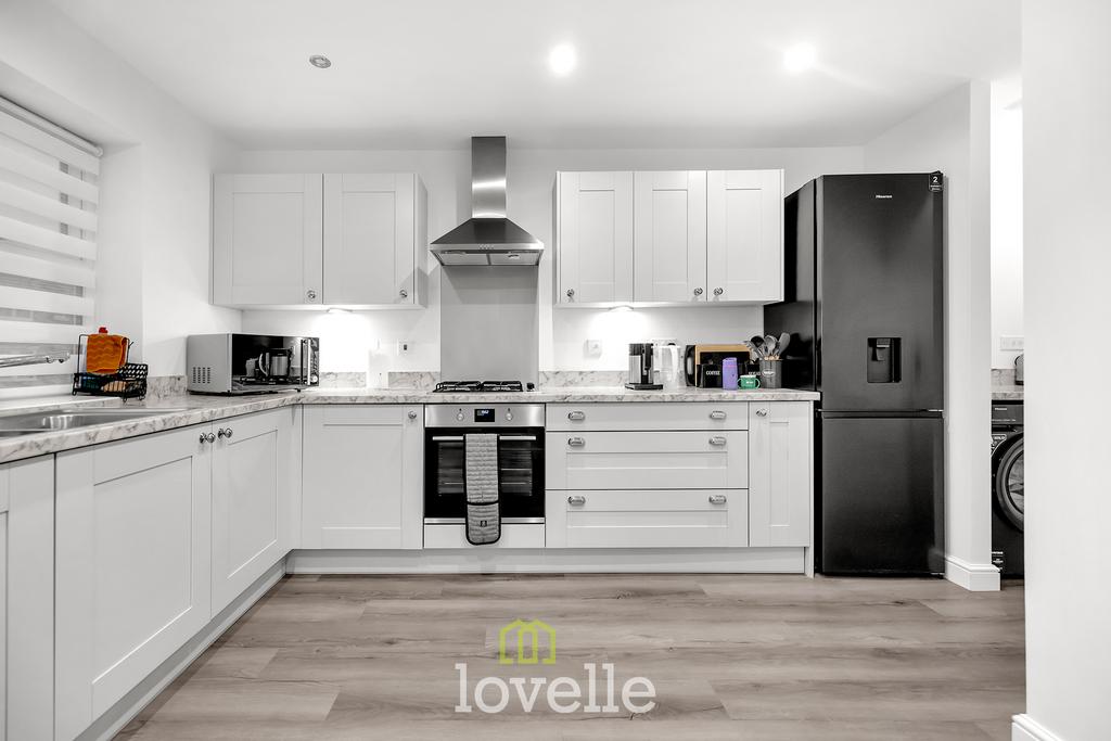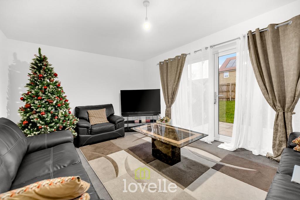 The property opens into a welcoming hallway with cloakroom and wc. A spacious lounge enjoys doors opening directly onto the large garden, ideal for everyday living and outdoor enjoyment. The modern kitchen features fitted units, oven and hob, a useful laundry area and space for a dining table. Gas central heating and uPVC double glazing are installed, and a driveway provides off-street parking.