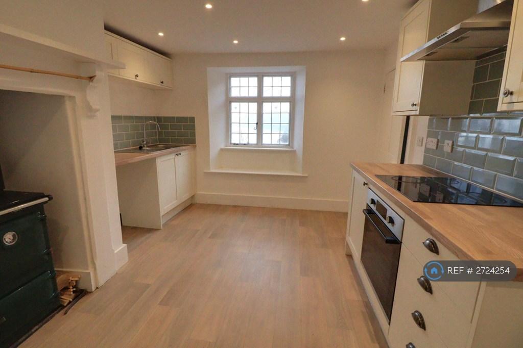 Furnished with a range of modern floor and wall units having roll top worksurface, tiled splash backing and inset stainless steel sink with mixer tap. Integrated electric oven with electric hob above and recirculating extractor over. Space and fittings are provided for additional white appliances. Convenient understairs storage area. Solid fuel rayburn set into chimney breast.