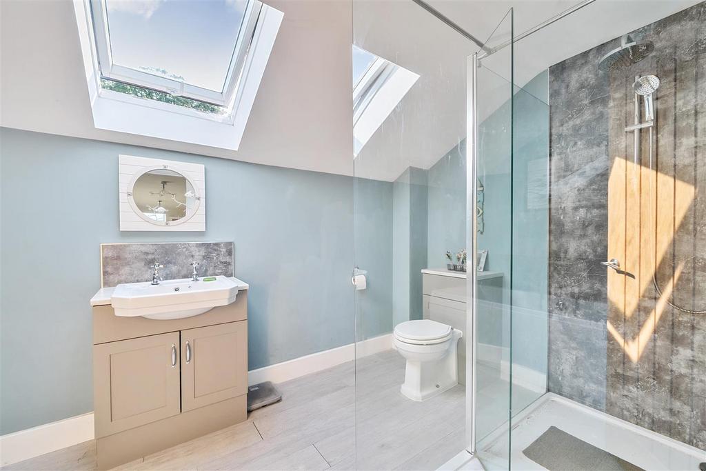 Stairs rise to the first-floor landing, giving access to all four bedrooms and the modern family bathroom with shower, standalone bath, heated towel-rail, vanity unit with inset wash basin and WC. The indulgently spacious master bedroom features expansive windows overlooking the garden and benefits from a large en suite with shower, bath, heated towel-rail, wash basin and WC. Bedroom 2 also enjoys an en suite, whilst all bedrooms benefit from built-in wardrobes.