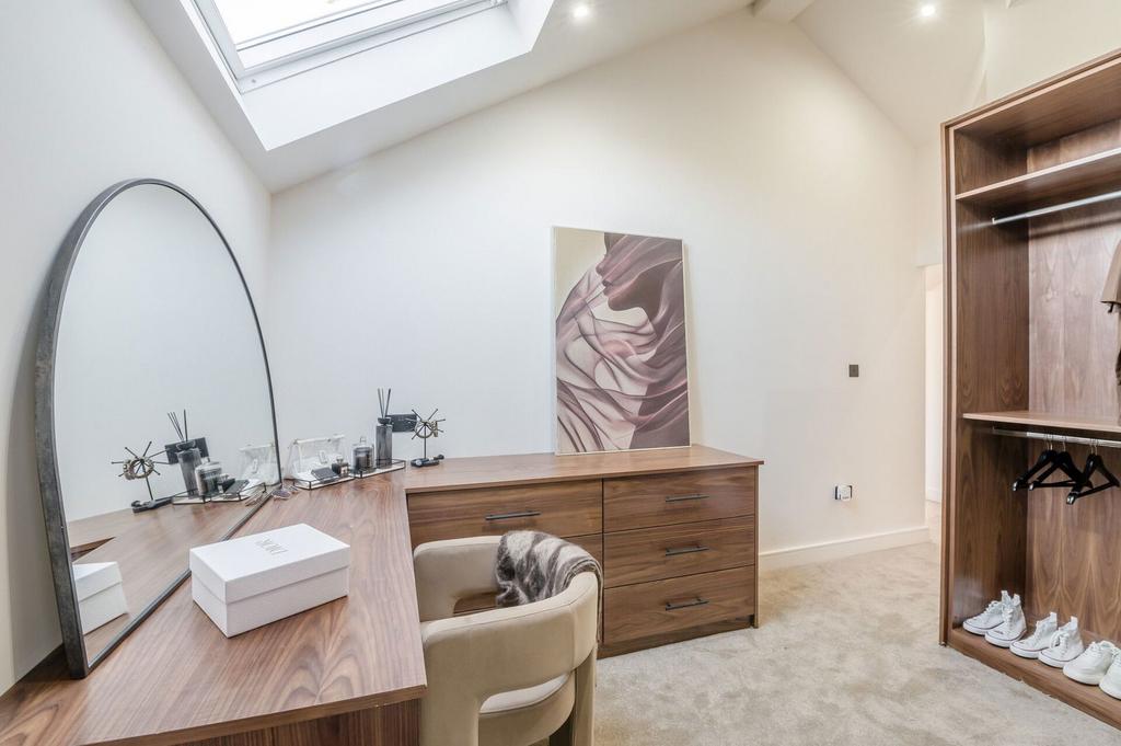 The principal bedroom suite is impressive from first view, the eye naturally drawn to angled windows ensuring natural light whilst also framing surrounding countryside. A vaulted ceiling results in a feeling of open space whilst a dressing room has open fronted wardrobes, drawer units and a dresser. The en-suite bathroom has complementary tiling to the walls and floor, a frosted window and furniture including a wall hung W.C, twin basins and a shower with a fixed glass screen.