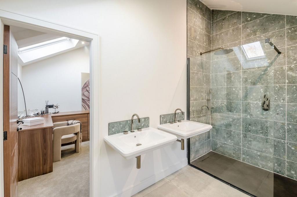 The family bathroom has a double ended bath with shower over, a wall hung W.C and a wash hand basin; feature tiling to the walls and floor, a frosted window and an exposed beam to a vaulted ceiling.