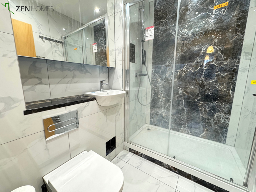 Located on the second floor, the property features a bright and spacious open-plan kitchen and living area, complete with integrated appliances and ample room for dining or entertaining. The master bedroom benefits from a sleek en-suite shower room, while the second double bedroom is served by a modern main bathroom.