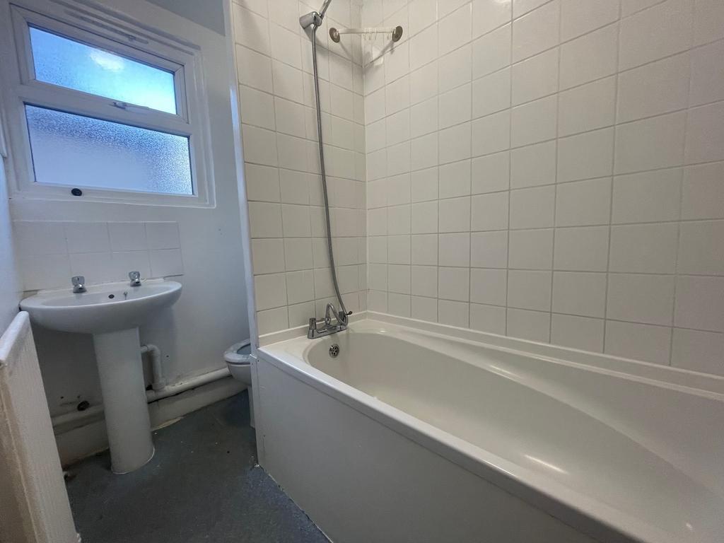 Three-Piece Bathroom Suite: Featuring a full-size bath with shower over, WC, and pedestal basin, all finished in white tiling.