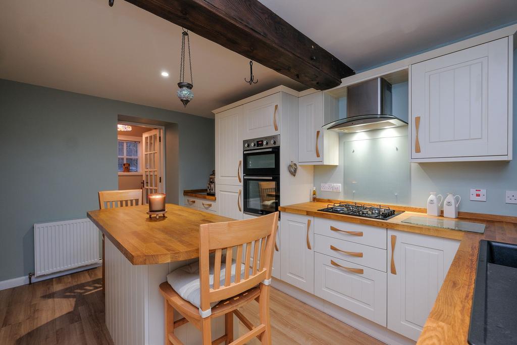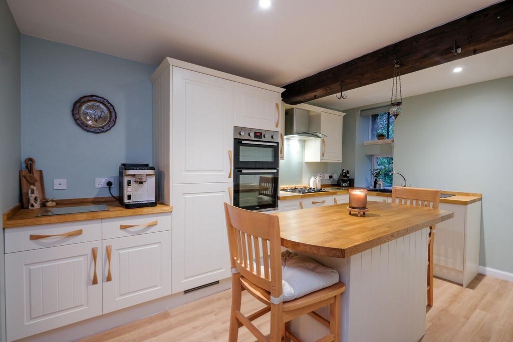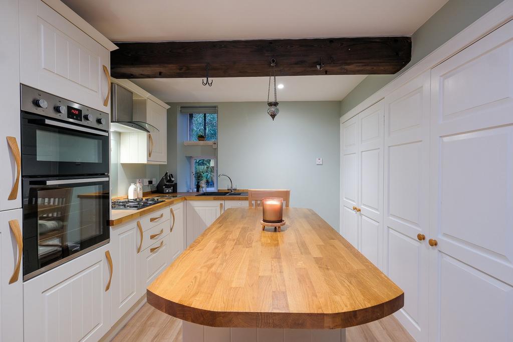 A fabulous country kitchen, which has been well designed. There is a selection of full length, base and overhead cupboards. An island in the middle, great for dining and additional space for food preparation. Equipped with a gas hob, extractor fan, fridge freezer and oven, which will be included in the sale.