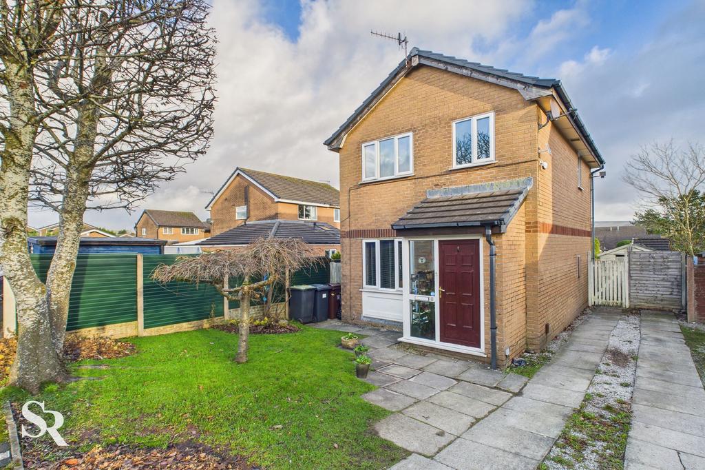 The front garden is neat and offers an attractive kerb appeal, primarily laid to lawn with a paved pathway leading to the entrance porch. A paved driveway runs down the side of the property, offering off-road parking and access to the rear garden/side of the house.