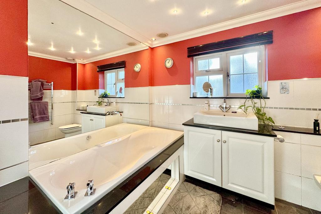 On the first floor, there are four well-proportioned double bedrooms. The primary bedroom includes a walk-in wardrobe and an en-suite shower room, while the remaining bedrooms are served by a modern family bathroom with a shower enclosure, luxury bath, WC, and hand wash basin. The top floor offers a versatile second bedroom, suitable as a guest suite or home office, with a walk-in wardrobe, en-suite shower room, and eaves storage.