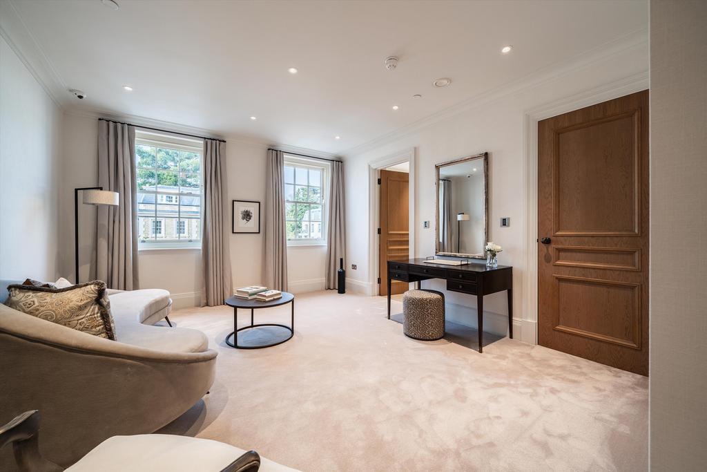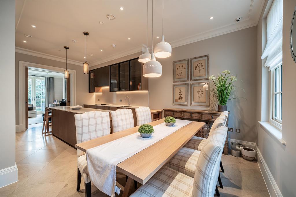 This wonderful townhouse is designed in a formal regency style, which integrates contemporary life within exquisite architectural detail. This property is an excellent example of a classic modern house. Steps lead up to the elegant stone portico opening to the reception hall. The ground floor boasts a stylish kitchen with integrated appliances. Pocket sliding doors connect from the kitchen/dining room through to the adjacent and impressive drawing room. This room has a feature fireplace with contemporary fire and two sets of French doors opening on to an elevated and private terrace.