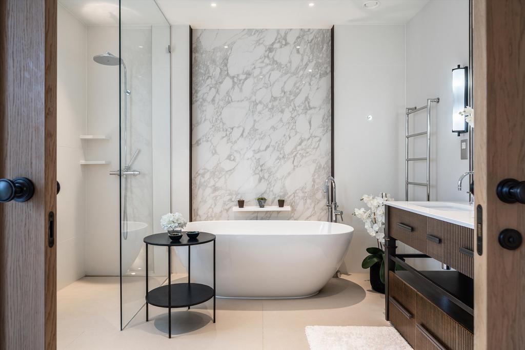 On the first floor is the principal bedroom. This beautifully designed room features a Juliet balcony that offers views over the gardens. It features double doors that lead into a luxurious en suite bathroom. There is also a fully fitted and bespoke dressing room. There are three further en suite bedrooms, cleverly arranged over two floors.