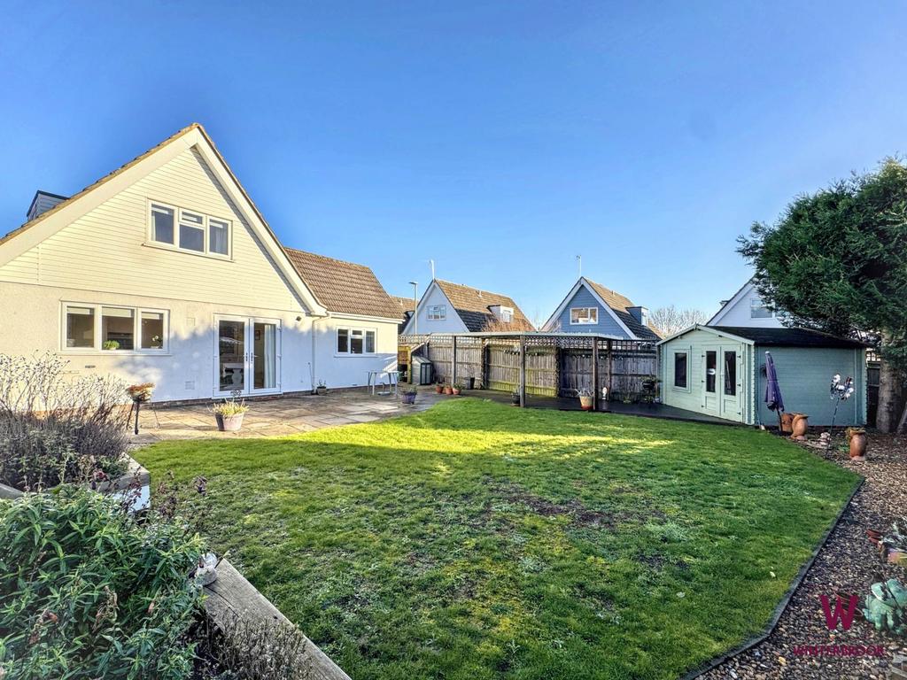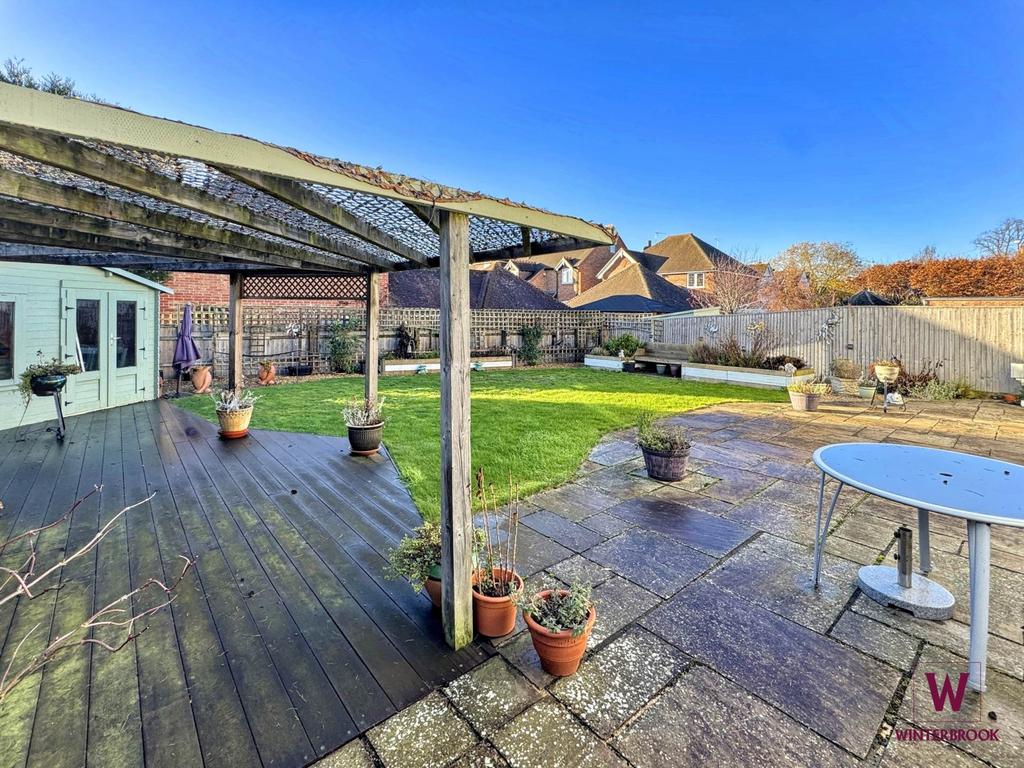 The delightful south-facing garden on a corner plot is a particular feature of the property, accessible from both sides and offering a large lawn, spacious patio, decked pagoda area, and a large summer house positioned at the far end.