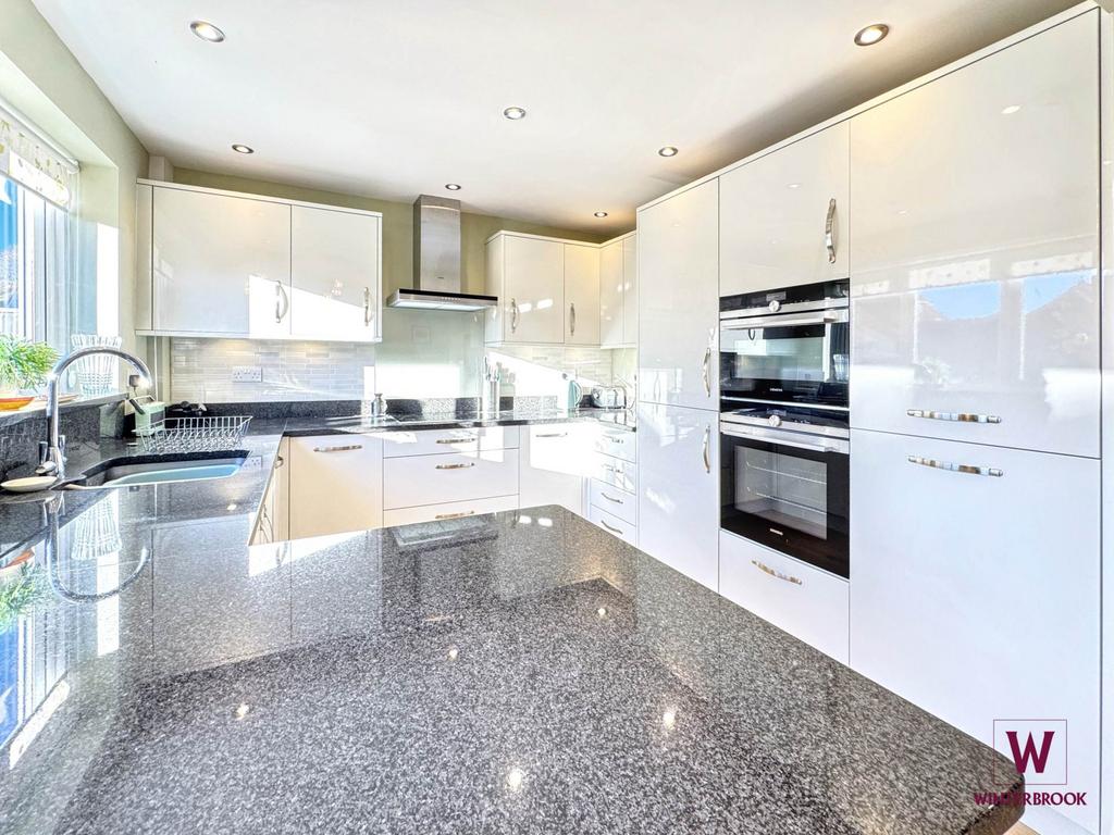 Upon entering, an attractive hallway leads to a large open-plan living area featuring a welcoming lounge with an elegant fireplace and a separate dining area. The rear-aspect kitchen offers modern fitted units, a granite work top with breakfast bar, space for a table and chairs, and direct access to the garden. High-quality Siemens integrated appliances include a double oven, induction hob, and extractor.