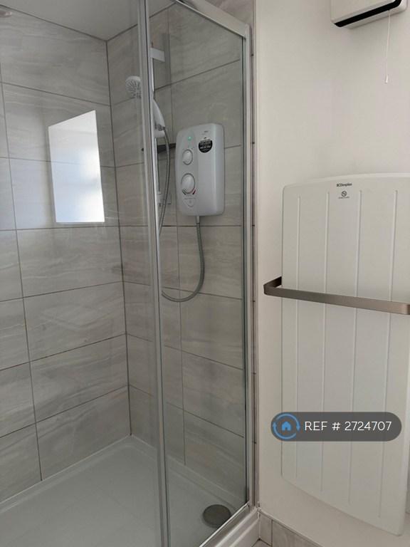 Bathroom with walk in tiled shower cubicle with Mira shower,vanity unit,cupboard, tiled floor,Dimplex panel heater & timed extractor fan.