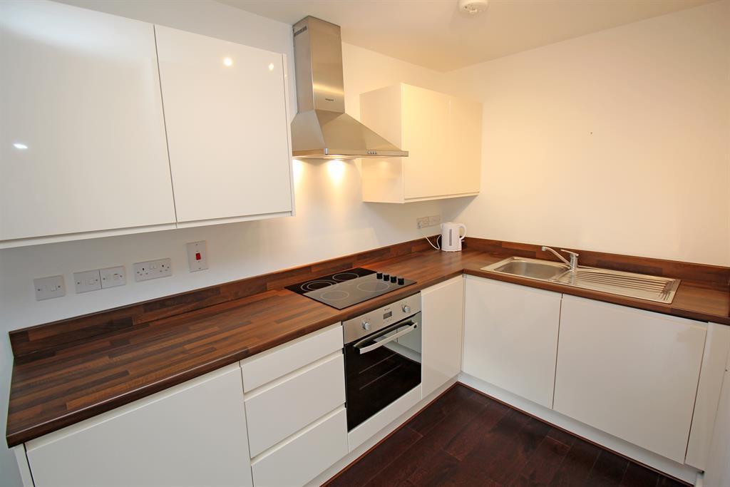Kitchen - 2.77 x 1.88 - Open plan to Lounge/Diner, Engineered wood flooring, Fitted in a range of matching white gloss wall and base units, Integral oven with electric hob above and extractor hood, Stainless steel sink with mixer tap and drainer, Integrated dishwasher and washer/dryer and Under counter Fridge with freezer box.