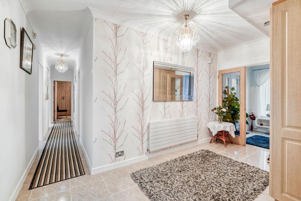 The accommodation comprises an enclosed porch leading into a welcoming entrance hallway with built-in storage and a guest WC. The spacious formal lounge features a front aspect bay window and a striking fireplace, while double doors open into the modern and well-appointed dining kitchen. This impressive space boasts feature roof lanterns, ample room for a dining table and chairs, and a stylish range of high-gloss wall and base units with integrated appliances. Leading from the kitchen, a generous conservatory creates a bright, uplifting setting overlooking the garden, complete with a charming log burner. The hallway further leads to the master bedroom, complete with ample built-in and fitted bedroom furniture and a contemporary en-suite shower room. There are three additional double bedrooms, with bedroom four currently utilised as a study. Completing the accommodation is a beautifully appointed bathroom, featuring built-in storage, a corner bath, and a separate corner shower enclosure.