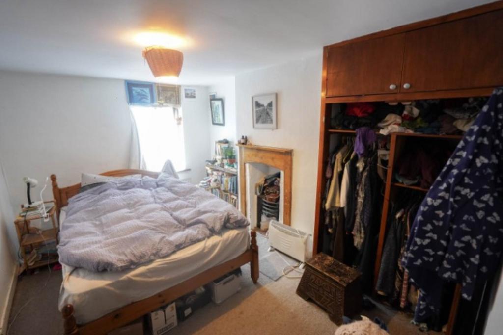 Window to southwest overlooking South Street and boatyard. Fireplace with wooden mantel, part-open double wardrobe cupboard with hanging rail and shelving, cupboards over, and radiator.