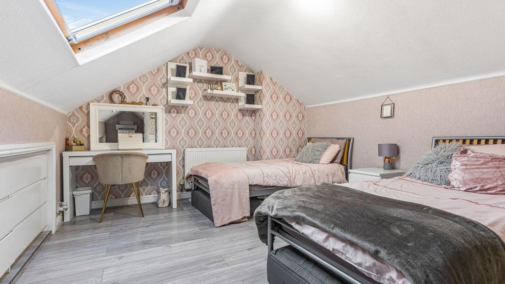 The first floor offers three well-proportioned bedrooms and a modern family bathroom, with a staircase rising to a converted loft room providing additional flexible space.