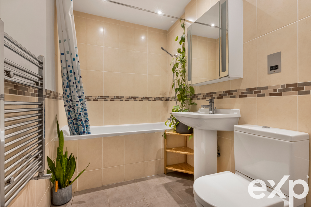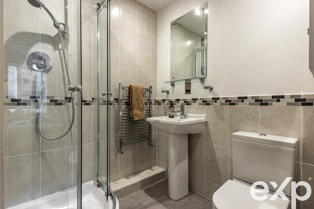 Both bedrooms come with built-in wardrobes, and the principal bedroom enjoys its own sleek en-suite shower room. The second bedroom is ideal as a guest room, nursery, or even a dedicated home office; a flexible space that can adapt as life evolves. There’s also a separate family bathroom, finished to the same modern standard, plus a handy hallway storage cupboard (because you can never have too much storage). The hallway itself is generous, offering enough space for additional furniture and even a small work-from-home setup.