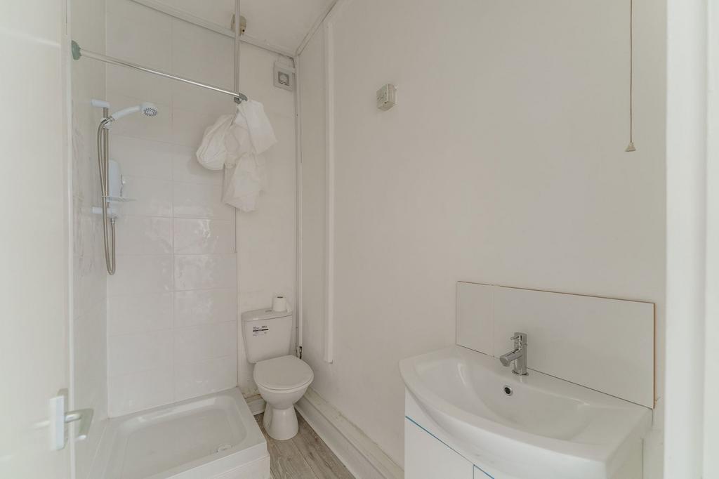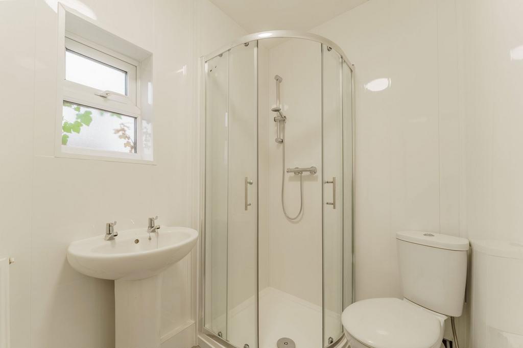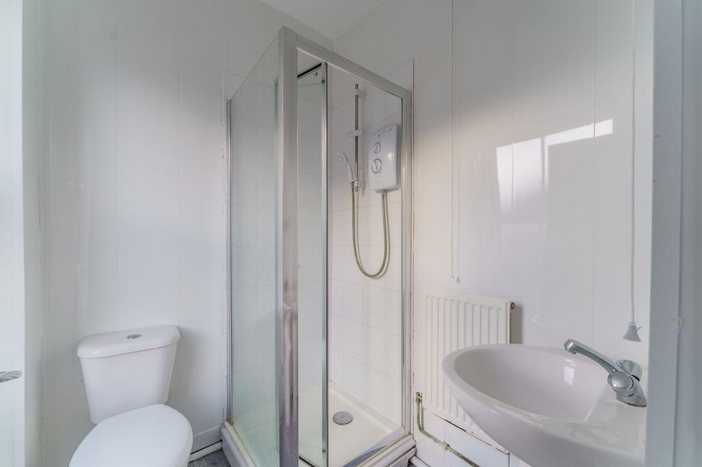 Fully panelled, shower cubicle, pedestal sink, W.C, radiator.